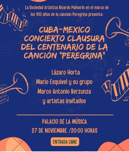 Música, 8 de la noche, Palacio de la Música.- Presentación musical con la participación de un conjunto y varios cantantes locales y de Cuba que se unieron en este evento para celebrar los 100 años de la creación de la canción Peregrina, escrita por el poeta Luis Rosado y musicalizada por Ricardo Palmerín, a petición del gobernador Felipe Carrillo Puerto, quien la dedicó a la periodista estadounidense Alma Reed, quien visitó la Península por motivos de trabajo. Entrada gratuita.